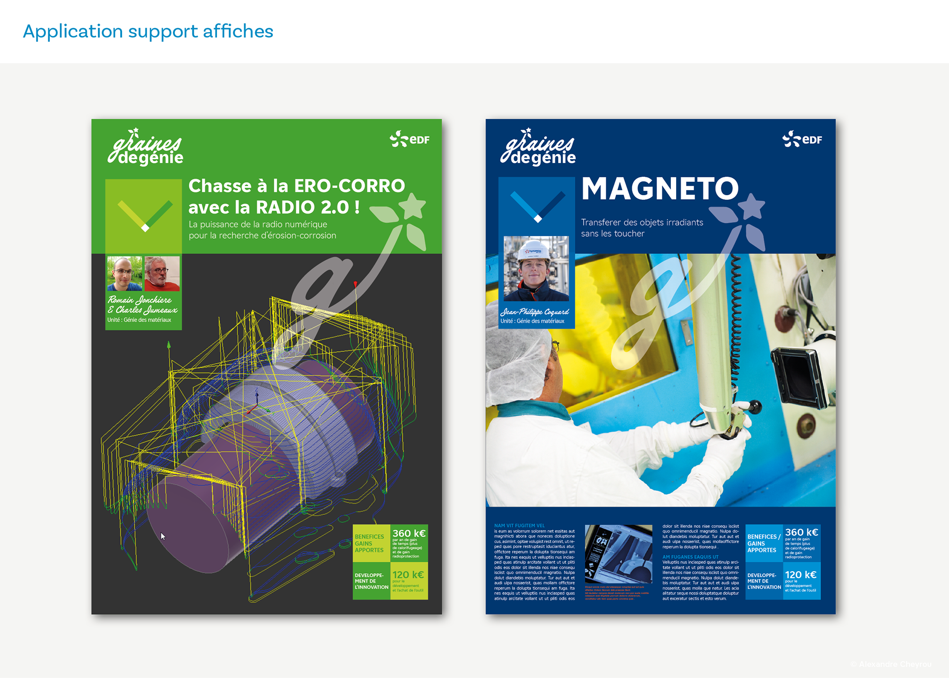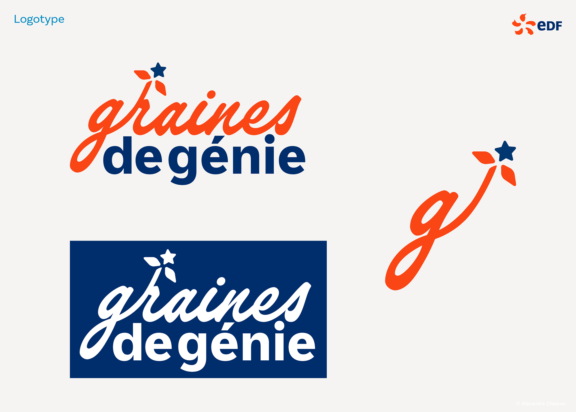 Proposition graphique pour "graîne de génie" qui récompense l'innovation chez edf, en mettant en valeur les projets et équipes R&D. Pour l'Agence Humancom.