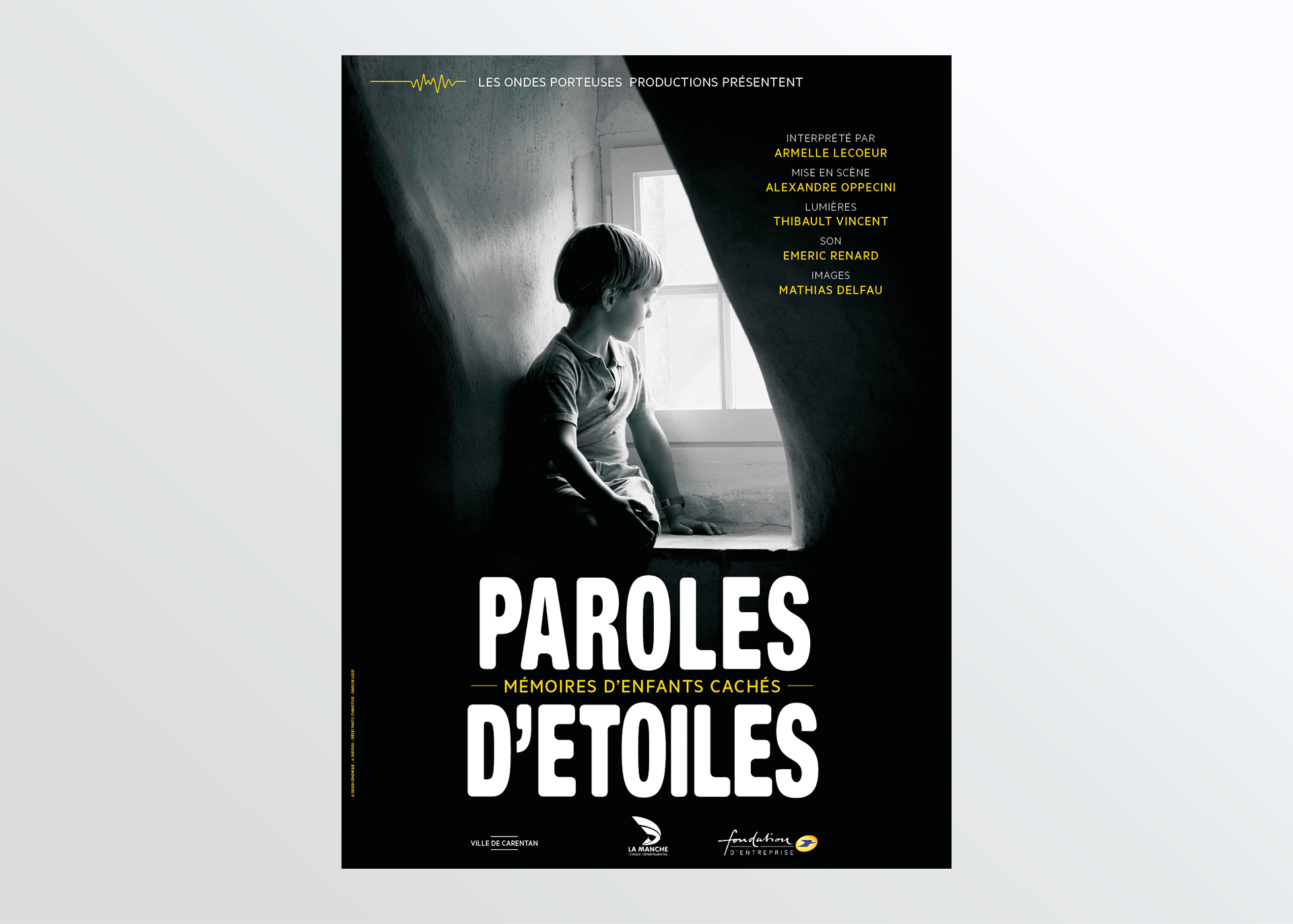 Affiche et communication de la pièce de théâtre "Paroles d'étoiles". Pièce construite à partir de témoignages d'enfants juifs cachés pendant la seconde guerre mondiale. Compagnie Les ondes porteuses